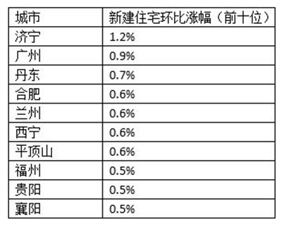具體到各城市房?jī)r(jià)表現(xiàn),國(guó)家統(tǒng)計(jì)局?jǐn)?shù)據(jù)顯示,11月份,新房?jī)r(jià)格環(huán)比漲幅排名前十的城市分別是濟(jì)寧、廣州、丹東、合肥、蘭州、西寧、平頂山、福州、貴陽(yáng)、襄陽(yáng)。其中山東濟(jì)寧成為全國(guó)新房?jī)r(jià)格上漲最快的城市,環(huán)比漲幅1.2%。