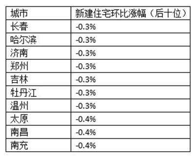 房?jī)r(jià)下降的城市中,排名70城最后十位的城市有南充、南昌、太原、溫州、牡丹江、吉林、鄭州、濟(jì)南、哈爾濱、長(zhǎng)春。其中南充、南昌、太原新房?jī)r(jià)格環(huán)比均下跌0.4%;其余7個(gè)城市新房?jī)r(jià)格環(huán)比下跌0.3%。