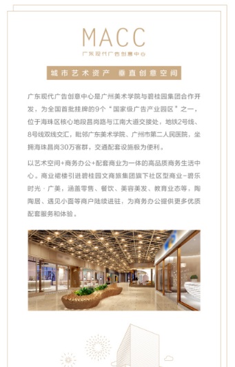 廣東現(xiàn)代廣告創(chuàng)意中心位于廣州美術(shù)學(xué)院,由碧桂園與廣州美術(shù)學(xué)院強(qiáng)強(qiáng)聯(lián)手打造,是集品質(zhì)生活、商務(wù)辦公、藝術(shù)空間于一體的全景式商務(wù)藝術(shù)創(chuàng)意中心。項(xiàng)目背靠得天獨(dú)厚的產(chǎn)業(yè)政策優(yōu)勢(shì),位列全國(guó)首批掛牌的9個(gè)國(guó)家級(jí)廣告產(chǎn)業(yè)園區(qū),也是國(guó)家重點(diǎn)扶持的創(chuàng)意文化經(jīng)濟(jì)園區(qū),集成創(chuàng)新行業(yè)資源總部集聚化、高端前沿化和產(chǎn)業(yè)聯(lián)動(dòng)化。