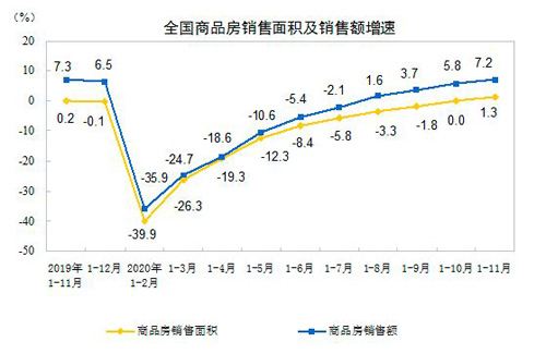 國家統(tǒng)計(jì)局?jǐn)?shù)據(jù)顯示,1—11月份,商品房銷售面積150834萬平方米,同比增長1.3%,增速比1—10月份提高1.3個(gè)百分點(diǎn)。其中,住宅銷售面積增長1.9%,辦公樓銷售面積下降12.8%,商業(yè)營業(yè)用房銷售面積下降11.1%。商品房銷售額148969億元,增長7.2%,增速提高1.4個(gè)百分點(diǎn)。其中,住宅銷售額增長9.5%,辦公樓銷售額下降10.7%,商業(yè)營業(yè)用房銷售額下降13.7%。