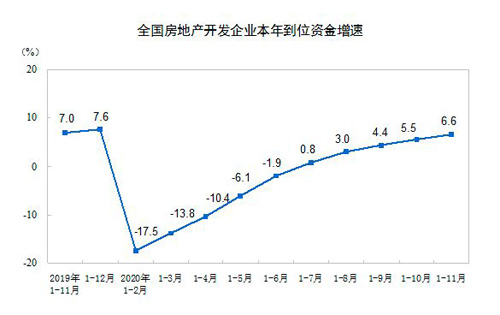 國家統(tǒng)計(jì)局?jǐn)?shù)據(jù)顯示,1—11月份,房地產(chǎn)開發(fā)企業(yè)到位資金171099億元,同比增長6.6%,增速比1—10月份提高1.1個(gè)百分點(diǎn)。其中,國內(nèi)貸款24256億元,增長5.4%;利用外資154億元,下降4.7%;自籌資金56666億元,增長7.9%;定金及預(yù)收款57384億元,增長5.3%;個(gè)人按揭貸款26983億元,增長10.6%。