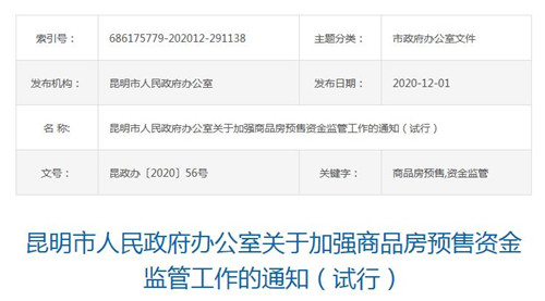 房訊網(wǎng)訊 12月2日,云南省昆明市政府辦公室下發(fā)了《關(guān)于加強(qiáng)商品房預(yù)售資金監(jiān)管工作的通知(試行)》,要求昆明市主城五區(qū)及三個(gè)國(guó)家級(jí)度假區(qū)范圍內(nèi)辦理商品房預(yù)售許可證的項(xiàng)目,其商品房預(yù)售資金需按照政府指導(dǎo)、銀行監(jiān)管、專戶?畹脑瓌t進(jìn)行監(jiān)管。