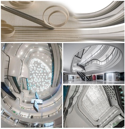 項(xiàng)目的室內(nèi)設(shè)計(jì)同樣是以現(xiàn)代設(shè)計(jì)手法帶出蘇州特色。商場(chǎng)1-5層的室內(nèi)空間設(shè)計(jì)靈感源自當(dāng)?shù)氐氖止に嚕暗瘛保?大量采用富于變化的曲線層層遞進(jìn),再利用垂直黑色的角鋼與光澤彎曲的白色平面互相碰撞,形成強(qiáng)烈的視覺(jué)對(duì)比,打造出具有江南氣息的現(xiàn)代時(shí)尚商業(yè)空間。