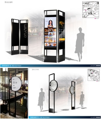 為配合這條建筑在西式商場(chǎng)內(nèi)的中式“姑蘇水街”,graphia革思亞以現(xiàn)代簡(jiǎn)約的設(shè)計(jì)手法融合蘇州園景特色,利用炭黑色輕巧通透的不銹鋼“屏風(fēng)”標(biāo)志框架,配上圓形石面的“蘇州園林花窗”信息板,讓標(biāo)識(shí)成為場(chǎng)景的一部份,除了提供導(dǎo)視功能外,也加強(qiáng)了區(qū)域的主題效果,從而增加游人的體驗(yàn),為物業(yè)品牌增值。