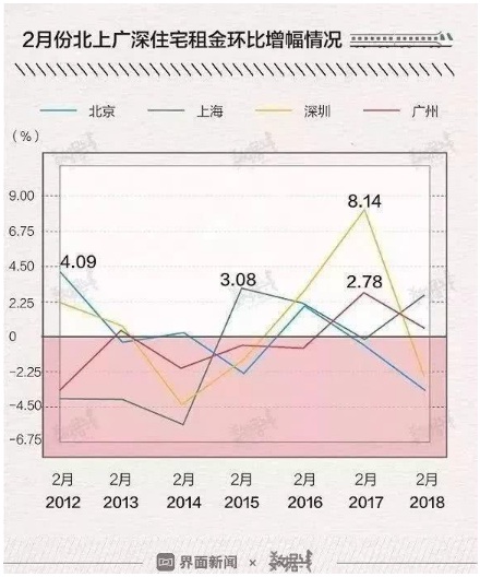 而租金也伴隨返工潮水漲船高。據(jù)界面新聞數(shù)據(jù)統(tǒng)計(jì),2012年至2018年,每年的2月份(大致為春節(jié)返程期),北上廣深四個(gè)城市的住宅租金變動(dòng)顯著。其中,2017年2月,深圳住宅租金環(huán)比增長(zhǎng)最高,達(dá)8.14%。