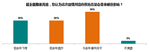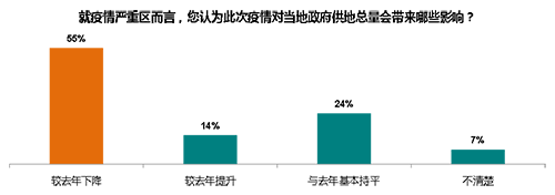 調(diào)查結(jié)果顯示,有38%的專家認(rèn)為受疫情影響,2020年全國(guó)供地總量將與去年基本持平,有28%的專家認(rèn)為較去年提升。綜合來(lái)看,50名地產(chǎn)專家認(rèn)為2020年全國(guó)層面的供地總量將呈穩(wěn)中有升的態(tài)勢(shì)。而對(duì)于疫情嚴(yán)重區(qū)來(lái)說(shuō),有55%的專家認(rèn)為2020年供地總量相比去年下降,供地總量將呈現(xiàn)穩(wěn)中有降的態(tài)勢(shì)。這可能是由于專家們考慮了相較其他地區(qū),疫情嚴(yán)重地區(qū)在影響程度和影響周期方面對(duì)全年供地總量的抑制將更加明顯。