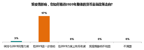 從總體的金融政策來(lái)看,調(diào)查結(jié)果顯示,有96%的專家認(rèn)為受疫情影響,2020年整體的貨幣金融政策相較于2019年有進(jìn)一步寬松的空間。從實(shí)際的政策動(dòng)態(tài)也印證了這點(diǎn),2月,人民銀行、財(cái)政部、銀保監(jiān)會(huì)、證監(jiān)會(huì)、外匯局等五部門(mén)聯(lián)合印發(fā)《關(guān)于進(jìn)一步強(qiáng)化金融支持防控新型冠狀病毒感染肺炎疫情的通知》,重點(diǎn)是加大貨幣信貸支持力度,保持流動(dòng)性合理充裕,進(jìn)一步強(qiáng)化金融對(duì)疫情防控工作的支持,維護(hù)經(jīng)濟(jì)穩(wěn)定發(fā)展大局。