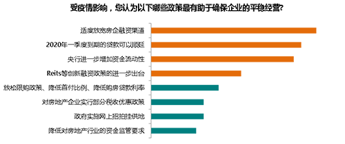 從政府政策建議方向來(lái)看,調(diào)查結(jié)果顯示,專家普遍認(rèn)為適度放寬房企融資渠道、央行進(jìn)一步增加資金流動(dòng)性、Reits等創(chuàng)新融資政策的進(jìn)一步深化、對(duì)符合規(guī)定的到期貸款進(jìn)行順延政策在當(dāng)前疫情影響下最有助于確保房企的平穩(wěn)經(jīng)營(yíng)?傮w來(lái)看,政策建議主要集中在確保企業(yè)的流動(dòng)性方面。