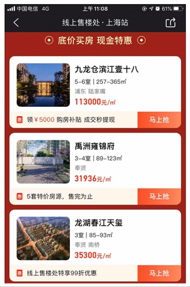 近年來(lái),房多多已與恒大、萬(wàn)科、綠地等百?gòu)?qiáng)品牌房企在全國(guó)范圍展開(kāi)合作,房多多線上售樓上線當(dāng)日,60余家品牌房企、200余家經(jīng)紀(jì)公司主動(dòng)留電申請(qǐng)加入合作。目前,平臺(tái)已上線超3000個(gè)特惠項(xiàng)目,覆蓋全國(guó)百余個(gè)城市!熬上售樓處”專題會(huì)場(chǎng)推出僅短短一周,已有重慶、上海、南京、廣州、武漢等城市客戶紛紛在線支付小訂,鎖定意向房源,這也正式打響疫期在線房地產(chǎn)交易第一槍。