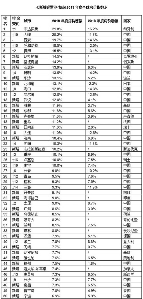 胡潤百富董事長兼首席調(diào)研員胡潤表示稱,2019年全球房價(jià)漲幅最高的前50名城市中,美國的上榜城市數(shù)量出現(xiàn)三年來最大的一次降幅,東歐快速上漲。