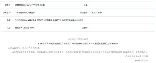 2月26日,廣州市住房和城鄉(xiāng)建設(shè)局發(fā)布《廣州市新就業(yè)無房職工公共租賃住房保障辦法》,《辦法》明確,新就業(yè)無房職工可申請(qǐng)公共租賃住房。
