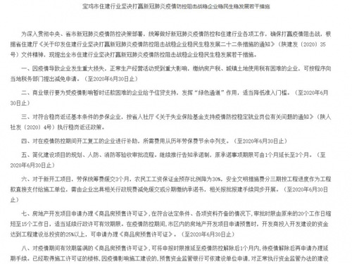 3月12日9時57分,陜西省寶雞市人民政府辦公室印發(fā)《寶雞市住建行業(yè)堅決打贏新冠肺炎疫情防控阻擊戰(zhàn)穩(wěn)企業(yè)穩(wěn)民生穩(wěn)發(fā)展若干措施》,措施共計15條,其中第12條明確,各銀行要積極爭取降低首套住房貸款首付比例政策,公積金貸款最高額度由40萬提高至50萬。