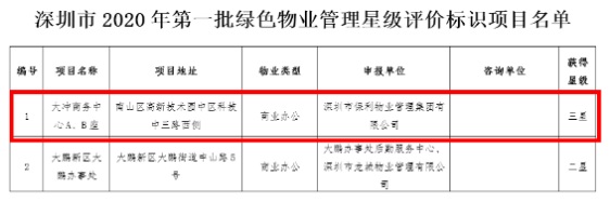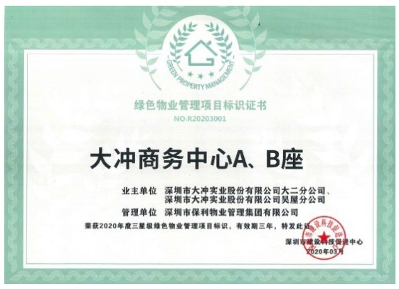 根據(jù)《<深圳經(jīng)濟特區(qū)物業(yè)管理條例>實施若干規(guī)定》(市政府令第258號)、《綠色物業(yè)管理評價標(biāo)準(zhǔn)》(SJG50-2018),深圳市建設(shè)科技促進(jìn)中心組織完成了大沖商務(wù)中心A、B座項目的專家評審與現(xiàn)場核查工作。并于2020年3月6日通過官方公示。大沖商務(wù)中心獲得了深圳市綠色物業(yè)管理項目星級評價標(biāo)識三星級認(rèn)證,這也是2020年度首批獲得“三星級綠色物業(yè)管理項目”稱號的物業(yè)企業(yè)。