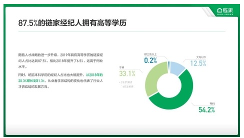 報(bào)告顯示,87.5%的鏈家經(jīng)紀(jì)人具有高等學(xué)歷,相比2018年凈增長(zhǎng)6.5%,遠(yuǎn)高于同業(yè)水平。同時(shí),統(tǒng)招本科學(xué)歷的經(jīng)紀(jì)人占比也大幅提升,從2018年的20.3%增長(zhǎng)到31.3%。