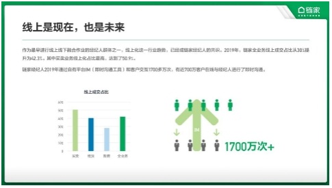 伴隨著產(chǎn)業(yè)互聯(lián)網(wǎng)的發(fā)展,線上化向房產(chǎn)領(lǐng)域的賦能越來(lái)越深入。作為最早進(jìn)行“線上+線下”融合作業(yè)的經(jīng)紀(jì)人群體,鏈家經(jīng)紀(jì)人正在積極擁抱線上化趨勢(shì)。報(bào)告顯示,2019年,鏈家全業(yè)務(wù)線上成交占比從30%提升至42.3%。其中買(mǎi)賣(mài)業(yè)務(wù)線上化占比最高,達(dá)到了50.9%。