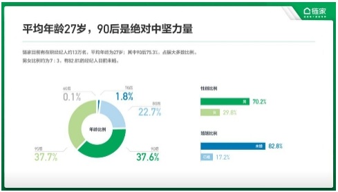 數(shù)據(jù)顯示,目前鏈家有在職經(jīng)紀(jì)人約13萬(wàn)名,平均年齡為27歲。其中90后是這一群體的中堅(jiān)力量,占比為75.3%。
