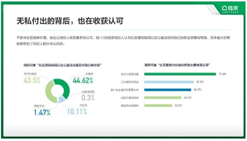 而提供社區(qū)服務(wù)也獲得了大多數(shù)鏈家經(jīng)紀(jì)人的肯定。調(diào)研顯示,88.1%的經(jīng)紀(jì)人認(rèn)為社區(qū)便民助民及公益活動(dòng)對(duì)自己的職業(yè)發(fā)展有幫助,其中最大的幫助是增加了經(jīng)紀(jì)人的社會(huì)認(rèn)同感。持續(xù)向社區(qū)提供價(jià)值,也在讓經(jīng)紀(jì)人收獲更多的社會(huì)認(rèn)可。