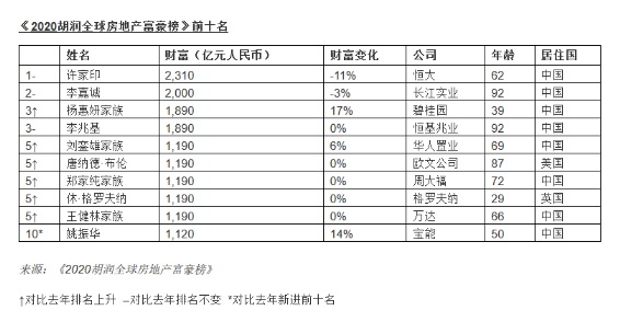 《2020胡潤(rùn)全球房地產(chǎn)富豪榜》顯示,前十名依次為許家印(2310億元人民幣,下同)、李嘉誠(chéng)(2000億)、楊惠妍家族(1890億)、李兆基(1890億)、劉鑾雄家族(1190億)、唐納德·布倫(1190億)、鄭家純家族(1190億)、休·格羅夫納(1190億)、王健林家族(1190億)、姚振華(1120億),其中許家印、李嘉誠(chéng)財(cái)富分別縮水11%和3%,楊惠妍家族、姚振華財(cái)富分別增加17%和14%。對(duì)比2019年,姚振華為今年(2020年)新進(jìn)前十名。