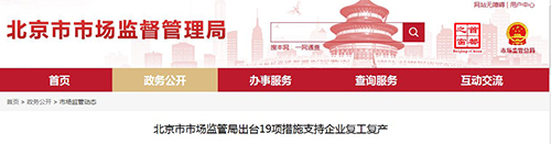 房訊網(wǎng)訊 近日,北京市市場監(jiān)管局出臺支持復(fù)工復(fù)產(chǎn)19項具體措施,包括推行網(wǎng)上辦理、實行告知承諾、延長許可有效期等九個方面,旨在助力北京市企業(yè)復(fù)工復(fù)產(chǎn),更好解決企業(yè)復(fù)工復(fù)產(chǎn)中面臨的實際問題。