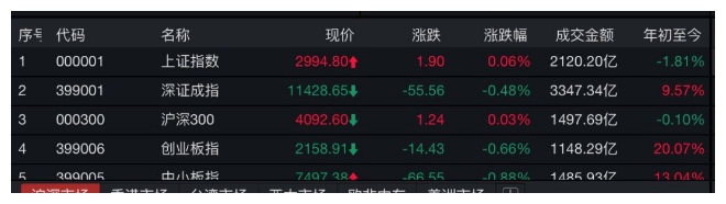 截至午間收盤,上證指數(shù)漲0.06%,報(bào)2994.80點(diǎn);深證成指跌0.48%,報(bào)11428.65點(diǎn);創(chuàng)業(yè)板指跌0.66%,報(bào)收2158.91點(diǎn)。兩市半日成交額為5467.54億元,其中,滬市成交2120.20億元,深市成交3347.34億元。