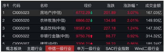 Wind數(shù)據(jù)顯示,截至午間收盤,中信一級行業(yè)板塊漲跌互現(xiàn),其中房地產(chǎn)板塊以3.07%的漲幅領(lǐng)漲,農(nóng)林牧漁、食品飲料、非銀行金融板塊紛紛跟漲;電子板塊跌幅居前。