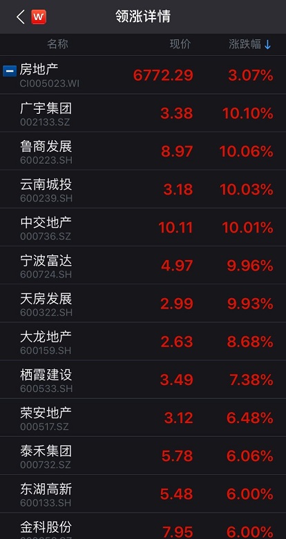 房地產(chǎn)板塊中,截至午間收盤,廣宇集團(tuán)、魯商發(fā)展、云南城投、中交地產(chǎn)、寧波富達(dá)、天房發(fā)展6只個(gè)股漲停;大龍地產(chǎn)、棲霞建設(shè)、榮安地產(chǎn)、秦禾集團(tuán)等多只個(gè)股漲逾6%。
