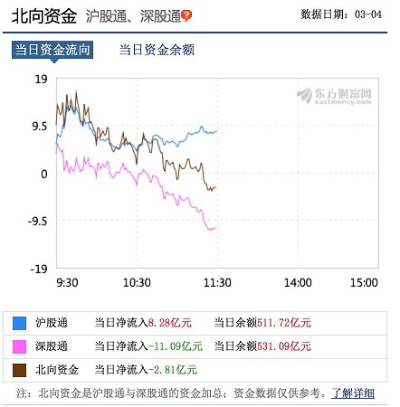 4日開盤不久,北向資金延續(xù)近日凈流入態(tài)勢,臨近中午收盤時(shí)轉(zhuǎn)為凈流出。東方財(cái)富網(wǎng)數(shù)據(jù)顯示,截至午間收盤,北向資金合計(jì)凈流出2.81億元,其中,滬股通凈流入8.28億元,深股通凈流出11.09億元。