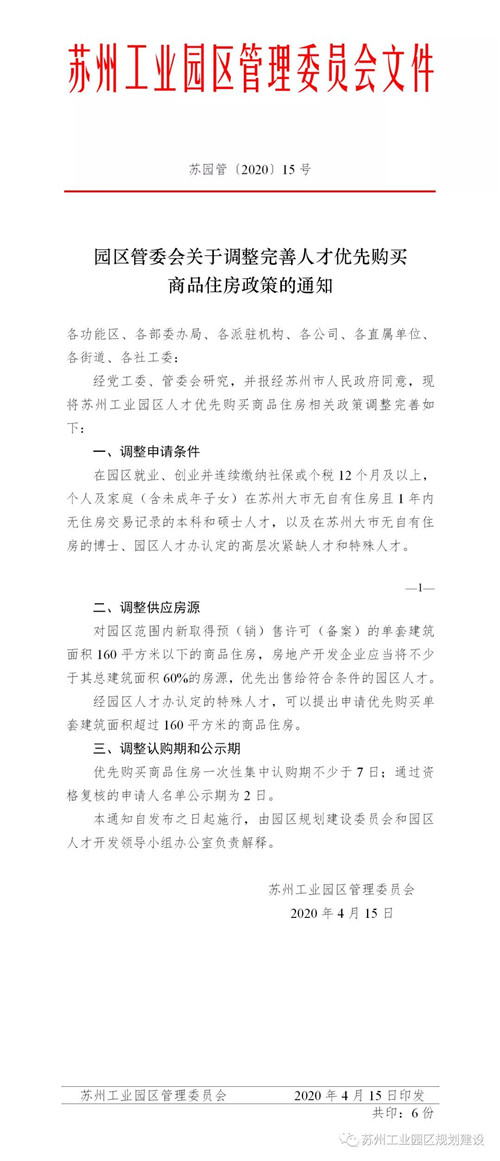 4月15日,蘇州工業(yè)園區(qū)規(guī)劃建設(shè)委員會(huì)官方公眾號(hào)發(fā)布《園區(qū)管委會(huì)關(guān)于調(diào)整完善人才優(yōu)先購(gòu)買(mǎi)商品住房政策的通知》(以下簡(jiǎn)稱(chēng)《通知》),提到對(duì)園區(qū)人才優(yōu)先購(gòu)買(mǎi)商品住房政策有所調(diào)整。