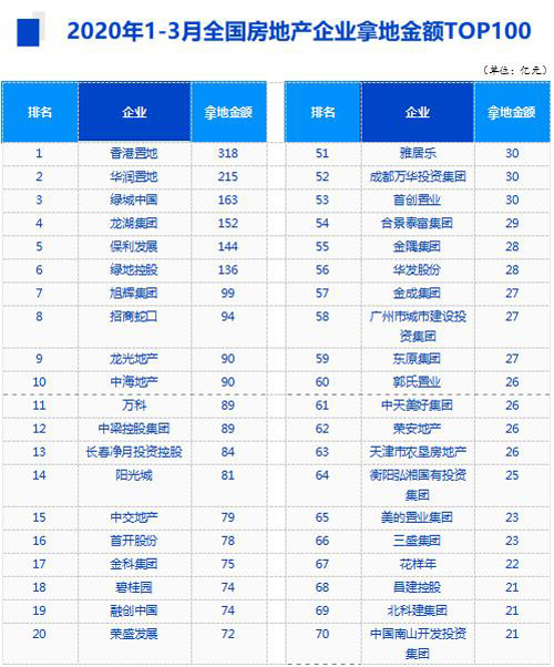 近日,中國(guó)指數(shù)研究院發(fā)布《2020年1-3月全國(guó)房地產(chǎn)企業(yè)拿地排行榜》。