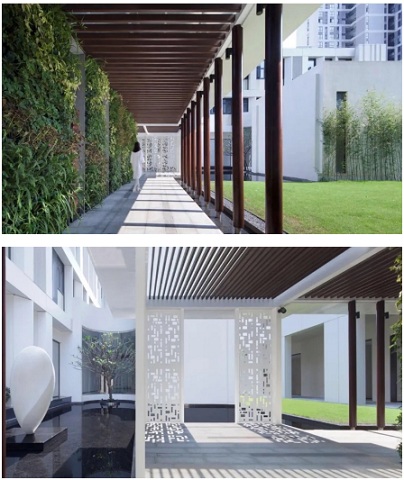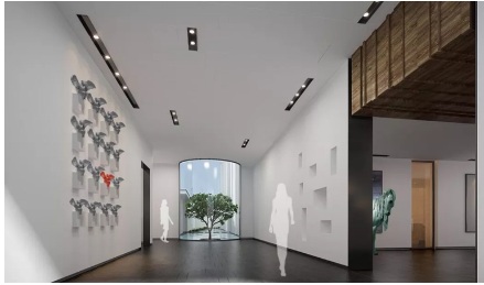 接待廳右邊是灰空間長廊,回頭通過一些洞口看到外面的景色。外面從洞口可以看到里面的藝術(shù)品局部,引起人的參觀欲望。藝術(shù)品定期更換,變化豐富。