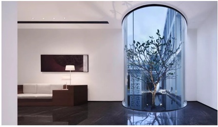 透過電梯廳的弧形玻璃,可看到戶外景觀樹。另外建筑頂部還開了一些采光天井,使空間更有趣味,同時白天不再需要開燈,節(jié)能環(huán)保。下午三點左右是天井下光影效果最豐富的時候,也正是客人到達的合適時間。
