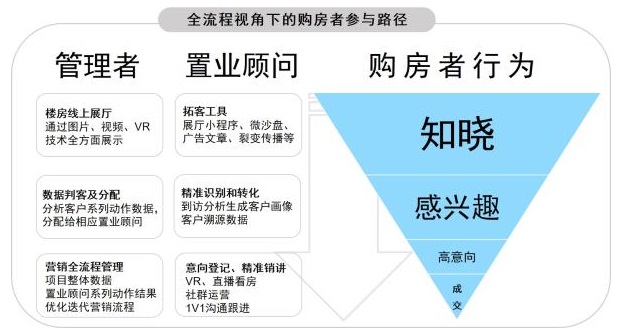 在新的競爭形式下,房地產(chǎn)客戶的全生命周期發(fā)生了變化。不管地產(chǎn)人是否樂意,整個營銷拓客行為已經(jīng)被前置,客戶對一個項目的初次印象產(chǎn)生在線上。也就是說,戰(zhàn)爭提前拉響,主戰(zhàn)場在線上,這是我們的第一個結(jié)論。再從全流程視角觀察營銷過程中購房者的參與路徑。從知曉-感興趣-高意向到成交,如果通過一套系統(tǒng)把每個環(huán)節(jié)都做數(shù)字化的沉淀和應(yīng)用,讓置業(yè)顧問更便捷地拓展更多客戶、更智能地管理高意向客戶,并打通線上咨詢和線下看房流程,我們就相當(dāng)于在整個戰(zhàn)線建造了一調(diào)隨取隨用源源不斷的彈藥供應(yīng)鏈。
