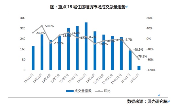 據(jù)貝殼研究院數(shù)據(jù),相比1月份量跌價(jià)穩(wěn)的態(tài)勢來說,2月市場低迷已經(jīng)傳導(dǎo)至價(jià)格。專家分析,目前成交量同比及環(huán)比均顯著下降的主要原因是由于疫情的影響,人口流動(dòng)降低,大量租賃人口滯留家鄉(xiāng)未返回居住地。短期內(nèi)供需不平衡,導(dǎo)致租金浮動(dòng),這屬于正常的市場行為。