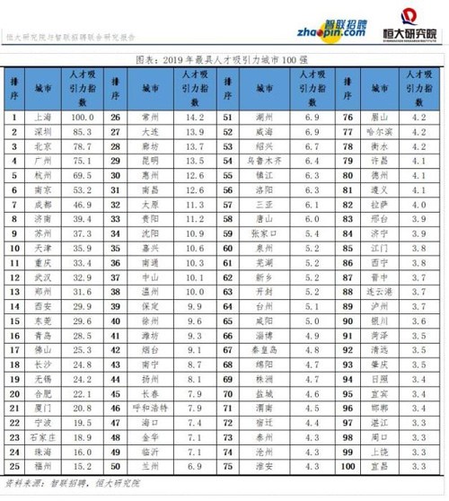恒大研究院、智聯(lián)招聘發(fā)布的《2019年最具人才吸引力城市100強》。