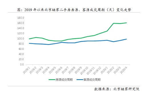 從市場(chǎng)情緒來看,目前北京二手房市場(chǎng)買賣雙方市場(chǎng)情緒較為平穩(wěn)。4月北京二手房房源成交周期環(huán)比拉長(zhǎng)3天至161天,客源成交周期環(huán)比拉長(zhǎng)5天至98天,買賣雙方成交周期均已達(dá)到歷史高位水平。