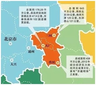 “北三縣”是河北省廊坊市三河、大廠、香河三個(gè)區(qū)域的統(tǒng)稱,地處北京、天津之間,與廊坊在地域上不相連,成為了一塊飛地!氨比h”與通州雖然分屬不同的行政區(qū)劃管轄,關(guān)系卻異常緊密,出現(xiàn)了北京是總部、生產(chǎn)研發(fā)在“北三縣”,北京工作、生活在“北三縣”等現(xiàn)象。目前,通州已經(jīng)成為北京城市副中心,北京的發(fā)展“邊界”向外延展,“北三縣”與通州之間的聯(lián)系愈加緊密,城市底板卻落差很大,迫切需要解決雙方在產(chǎn)業(yè)結(jié)構(gòu)、交通規(guī)劃、生態(tài)環(huán)境等多方面存在“不協(xié)調(diào)”問題。