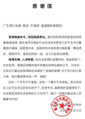 湖北省烹飪酒店行業(yè)協(xié)會向鼎龍·天海灣發(fā)來感謝信:“對于您們的大愛之舉,我們要誠摯地說一聲:謝謝!”