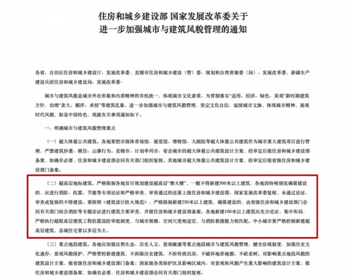 直至今年4月27日,住建部、國(guó)家發(fā)改委發(fā)布通知,對(duì)新建500米以上、250米以上及100米以上建筑進(jìn)行了規(guī)范。通知稱,在超高層地標(biāo)建筑方面,要嚴(yán)格限制各地盲目規(guī)劃建設(shè)超高層“摩天樓”,一般不得新建500米以上建筑,各地因特殊情況確需建設(shè)的,應(yīng)進(jìn)行消防、抗震、節(jié)能等專項(xiàng)論證和嚴(yán)格審查,審查通過的還需上報(bào)住房和城鄉(xiāng)建設(shè)部、國(guó)家發(fā)展改革委復(fù)核,未通過論證、審查或復(fù)核的不得建設(shè)。