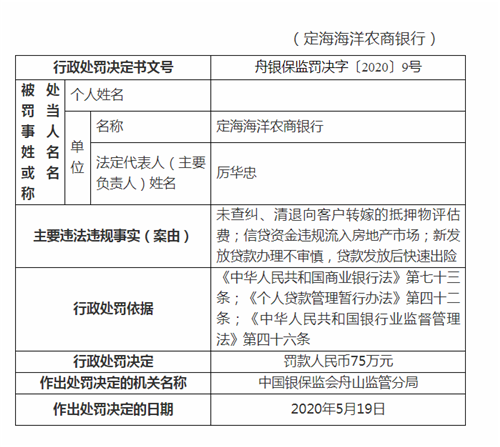 處罰公開(kāi)信息披露稱,定海海洋農(nóng)商銀行未查糾、清退向客戶轉(zhuǎn)嫁的抵押物評(píng)估費(fèi);信貸資金違規(guī)流入房地產(chǎn)市場(chǎng);新發(fā)放貸款辦理不審慎,貸款發(fā)放后快速出險(xiǎn)。