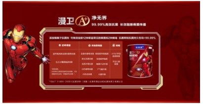 漫衛(wèi)A+系列產(chǎn)品中以雷神為包裝標(biāo)識的漫衛(wèi)A+醛無蹤內(nèi)墻漆,特別添加了硅藻精華和凈能活性因子(美國發(fā)明專利,專利號:US9255212;中國發(fā)明專利,專利號:ZL201210032451.4),能夠吸收和分解新裝后家具、地板等釋放的甲醛等有害物質(zhì),凈化率高達(dá)88%。外包裝印有蜘蛛俠造型的漫衛(wèi)A+霉無影內(nèi)墻漆,添加了防霉因子,漆膜致密,一邊長效阻止水分滲透入墻面,一邊有效防止霉菌滋生,抑制霉味的產(chǎn)生,防霉等級更是達(dá)到0級的最高防霉等級。印著美國隊長形象的漫衛(wèi)A+全方衛(wèi)內(nèi)墻底漆,作為涂裝系統(tǒng)的第一層,它能覆蓋原本墻面上細(xì)微的裂紋瑕疵,提高漆面的豐滿度;強效抗堿,預(yù)防日后墻面泛堿、發(fā)花;提高面漆附著力,避免面漆開裂起皮,使得家居墻面壽命更長。