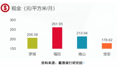 戴德梁行數(shù)據(jù)顯示,羅湖區(qū)的需求持續(xù)外流,再加上個(gè)別商務(wù)空間運(yùn)營(yíng)商租約到期,空置率達(dá)到14.98%,租金則下降至每月每平方米206.58元。福田區(qū)也在市場(chǎng)競(jìng)爭(zhēng)加劇背景下租金下降至每月每平方米261.95元,空置率為16.04%。而南山區(qū)的空置率上行至34.85%,租金同樣下降至每月每平方米213.94元。