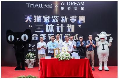 (前排右起:愛夢集團副董事長吳鄂先生與天貓家裝行業(yè)總經(jīng)理蕭勇(風弛)先生,正式簽署雙方新零售戰(zhàn)略合作協(xié)議)