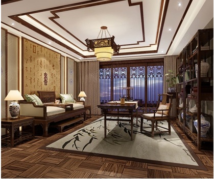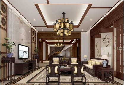 本案在硬裝上,中式鏤空隔斷元素以及高雅手繪墻紙等材質(zhì)的渲染下與現(xiàn)代的裝飾手法相結(jié)合;在軟裝上,家具配以明清時代的中式家具進(jìn)行呼應(yīng)。