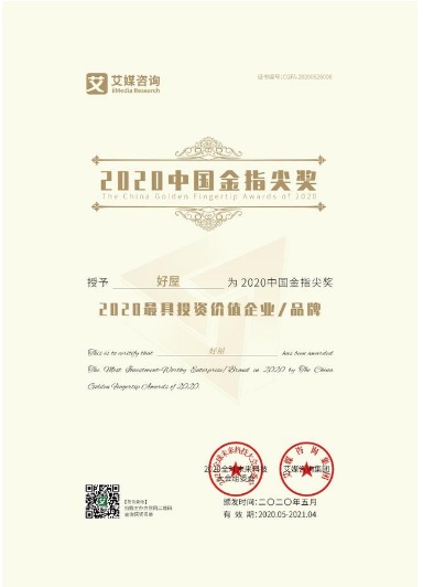 "中國金指尖獎(jiǎng)"由全球領(lǐng)先的新經(jīng)濟(jì)行業(yè)數(shù)據(jù)挖掘和分析機(jī)構(gòu)艾媒咨詢主辦,邀請(qǐng)了20余家權(quán)威的行業(yè)協(xié)會(huì)、投資機(jī)構(gòu)及行業(yè)專家與全球海量網(wǎng)民共同參與評(píng)選,并借助艾媒大數(shù)據(jù)輿情監(jiān)測系統(tǒng)分析,進(jìn)行公平公正權(quán)威評(píng)選,為業(yè)界提供了一個(gè)權(quán)威有力量的產(chǎn)品和品牌的評(píng)選平臺(tái)。好屋經(jīng)過重重篩選,在眾多企業(yè)競爭中脫穎而出,捧得"2020中國金指尖獎(jiǎng)-最投資價(jià)值企業(yè)"獎(jiǎng)。