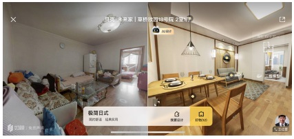 用戶在貝殼找房平臺(tái)上瀏覽二手房源時(shí),僅需點(diǎn)擊房源詳情頁(yè)或VR頁(yè)面里的的“設(shè)計(jì)效果”,即可獲得由AI生成的全屋設(shè)計(jì)解決方案。它包含平面方案、硬裝軟裝搭配方案、三維效果,讓用戶可以游走在“裝修”后的客廳、餐廳、臥室各功能區(qū),移步換景,查看每一處細(xì)節(jié)。同時(shí),貝殼未來(lái)家還能隨時(shí)與裝修前的屋內(nèi)真實(shí)場(chǎng)景進(jìn)行同屏對(duì)比,直觀了解如何對(duì)現(xiàn)有空間進(jìn)行改造。