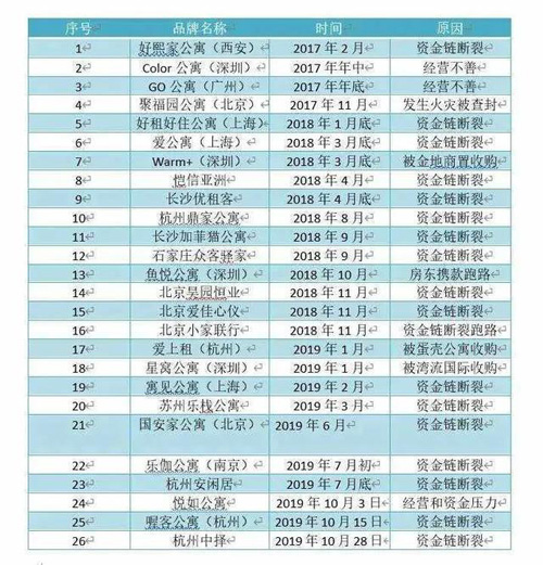 根據(jù)網(wǎng)上流傳的一份倒閉名單,2017年有4家長租公寓品牌倒閉,而到2018年又有12家因資金鏈鍛煉而退出,其中甚至還有魚悅公寓這樣房東攜款跑路的極端個案存在。
