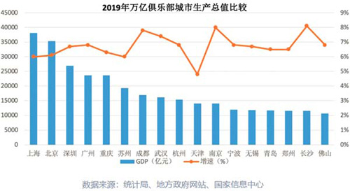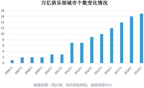 截止2019年年末,我國共有17座城市入圍“萬億俱樂部”行列,比2018年增加1個(gè),比2010年增加7個(gè)。這17個(gè)城市分別是:北京、天津、上海、重慶、南京、蘇州、無錫、杭州、寧波、青島、鄭州、武漢、長沙、廣州、深圳、佛山、成都。