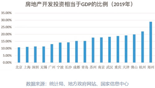 所幸的是鄭州近幾年也一直在努力減少對房地產(chǎn)的依賴:2017年鄭州房地產(chǎn)開發(fā)投資相當(dāng)于GDP的比例比是36.8%,2018年占比是32.1%,而到了2019年下降為28.9%。
