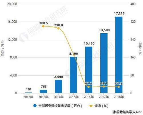 2012-2018年全球可穿戴設(shè)備出貨量統(tǒng)計及增長情況(數(shù)據(jù)來源:前瞻網(wǎng))