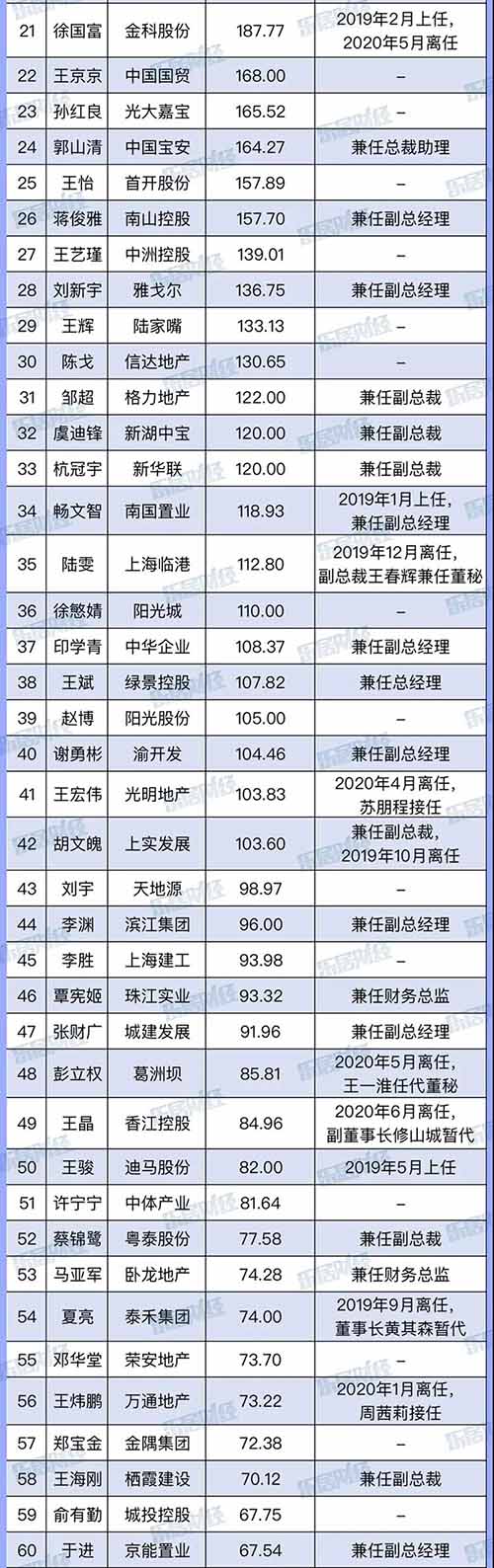 房地產(chǎn)是個(gè)造富的行業(yè),房企高管千萬(wàn)年薪及高額分紅屢見(jiàn)不鮮,董秘的薪酬能達(dá)到什么水平?2019年,90位A股上市房企董秘總薪酬約1.22億元,同比增長(zhǎng)16.2%;平均薪酬135.13萬(wàn)元,同比增長(zhǎng)8.8%。其中,萬(wàn)科朱旭以568.30萬(wàn)元薪酬蟬聯(lián)A股上市房企 “最貴”董秘,綠地王曉東以518.59萬(wàn)元薪酬位列第二。